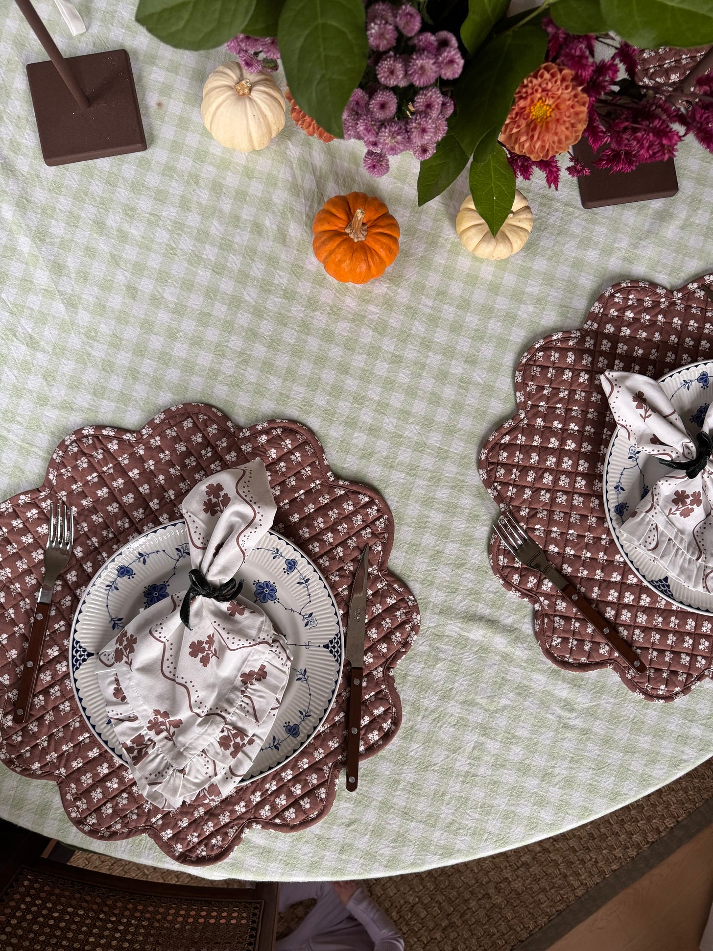 I combined our green gingham tablecloth (just a few rectangle sizes left), Constance placemats (preorders shipping in two weeks), and the new Beatrice napkins. Styled with a simple fall arrangement and plenty of greenery, the whole table came to life — warm, fresh, and welcoming. I’m already planning to recreate it for our Thanksgiving dinner.